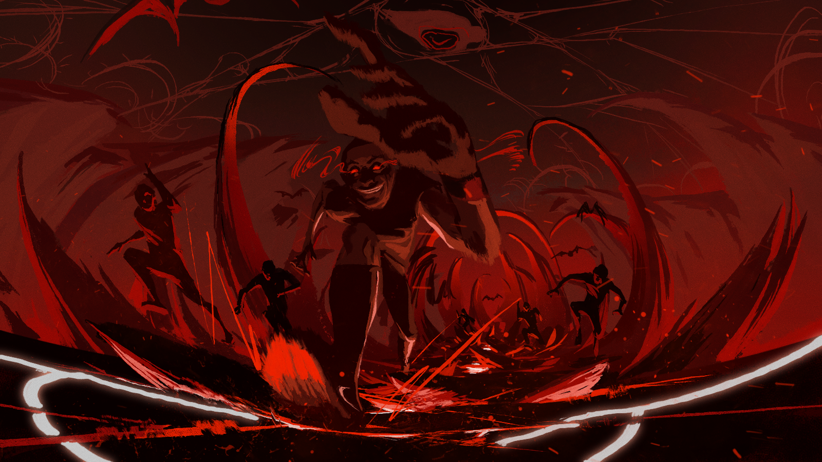 The initial script for Speed had the players falling into a hellish abyss populated by demons and big scary eyes. It reminded me of the gate in Fullmetal Alchemist, so I threw in grabby hands to drag the players into hell. Janek & Siana’s art blew me away once again!